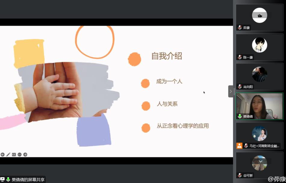 樊倩倩教授针对当代老员工的实际生活和学习情况,在进行自我介绍后,分别从“成为一个人”“人与关系”“从正念看心理学的应用”三个方面进行分享。