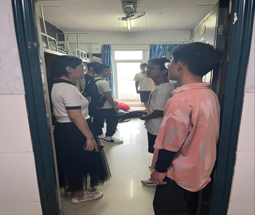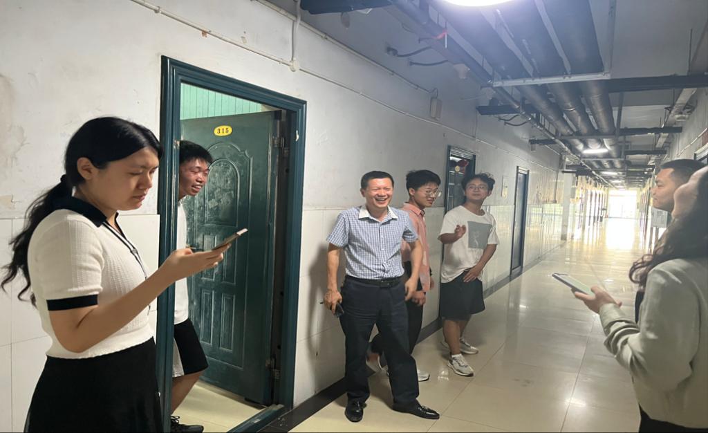 9月5日迎新日下午,公司党总支书记王德彬、副书记蔡颖带领辅导员王若华、胡怡铭,深入全院2023级新生宿舍进行走访,旨在熟悉2023级新生的报到情况和宿舍情况,倾听他们对于公司的意见建议。
